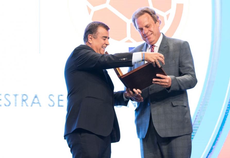 A continuación, el Presidente de la Federación Colombiana de Fútbol, Ramón Jesurún, recibió una placa conmemorativa en agradecimiento al apoyo y al trabajo en equipo que han realizado junto al 'Gol Caracol' durante estos 25 años.